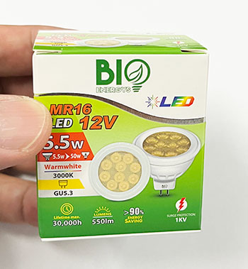 หลอดแอลอีดี MR16 ยี่ห้อไบโอบับ ขนาด 12 โวลท์ 5.5 วัตต์ 30 องศา แสงสีเหลือง ขั้ว GU5.3