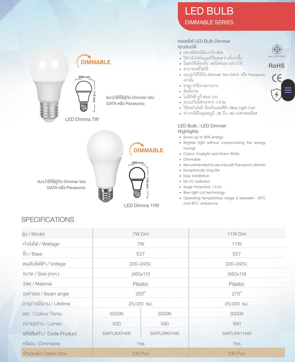 หลอดแอลอีดียี่ห้อ การ์ต้า 7 วัตต์ แสงสีเหลือง ขั้ว E27 – หรี่แสงได้