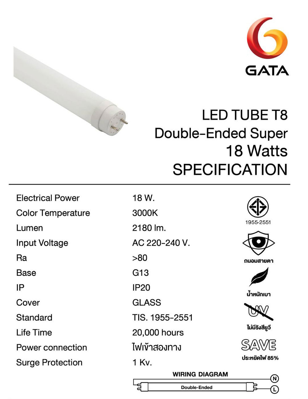 หลอดแอลอีดี T8 ยี่ห้อกาต้า หลอดยาว 18 วัตต์ 2180 ลูเมน แสงสีเหลือง วอมไวท์