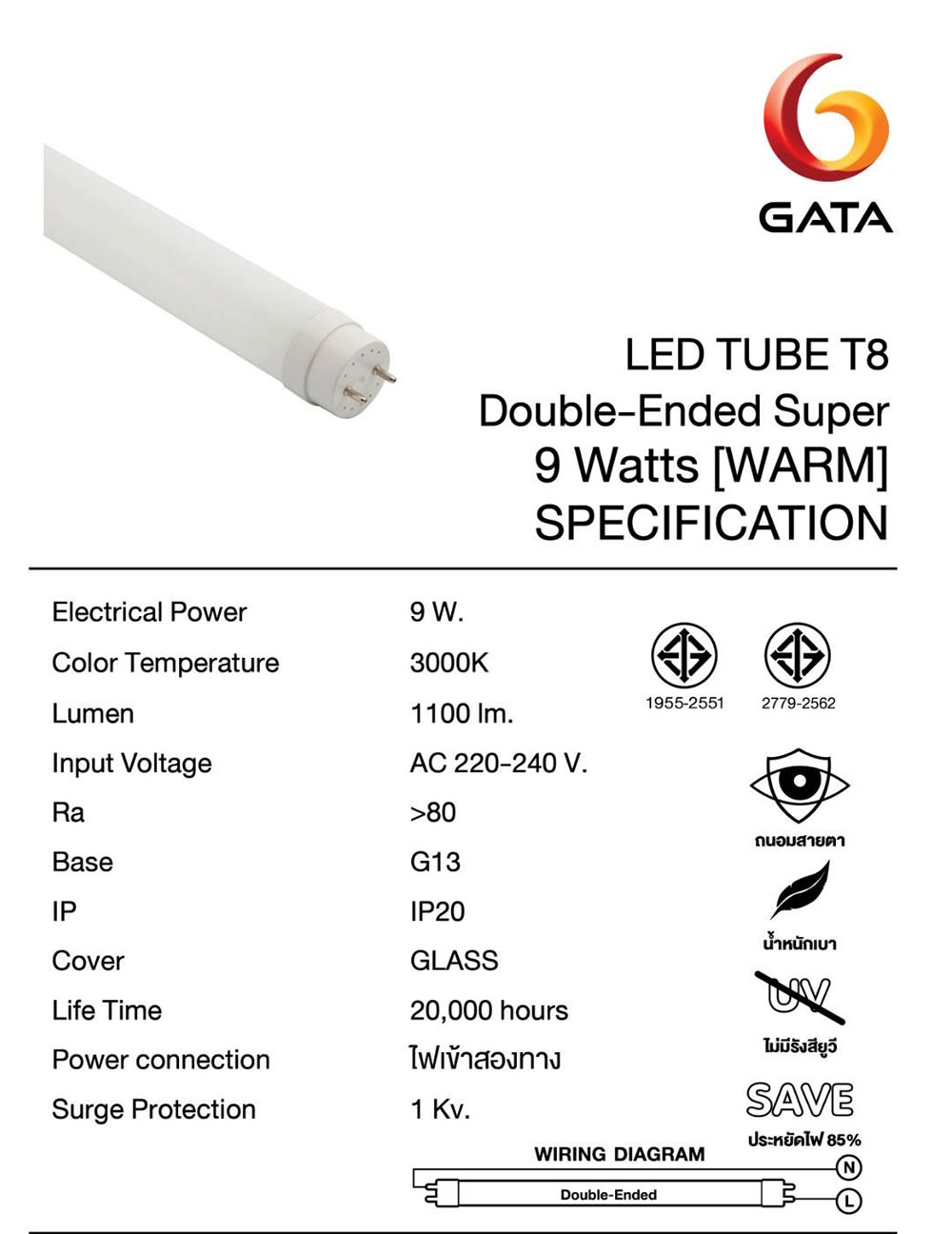 GATA SUPER T8 LED 9W 3000K 1100lm (60cm.)