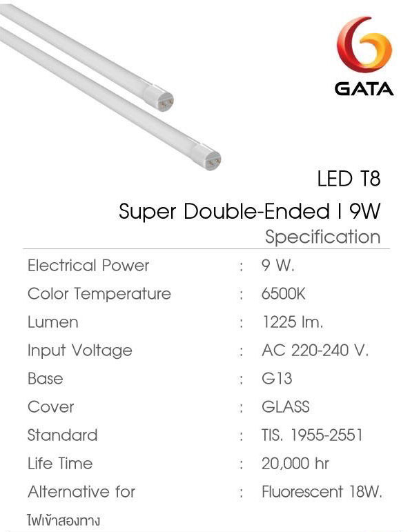 หลอดแอลอีดี T8 ยี่ห้อกาต้า หลอดสั้น 9 วัตต์ 1250ลูเมน แสงสีขาว