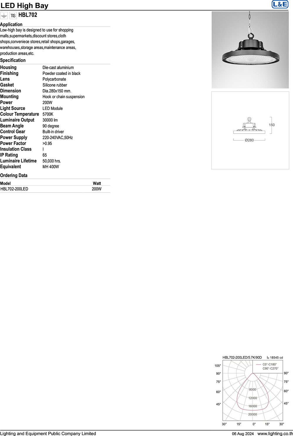 โคมไฮเบย์แอลอีดี ยี่ห้อ แอลแอนด์อี ขนาด 200 วัตต์ แสงสีขาว