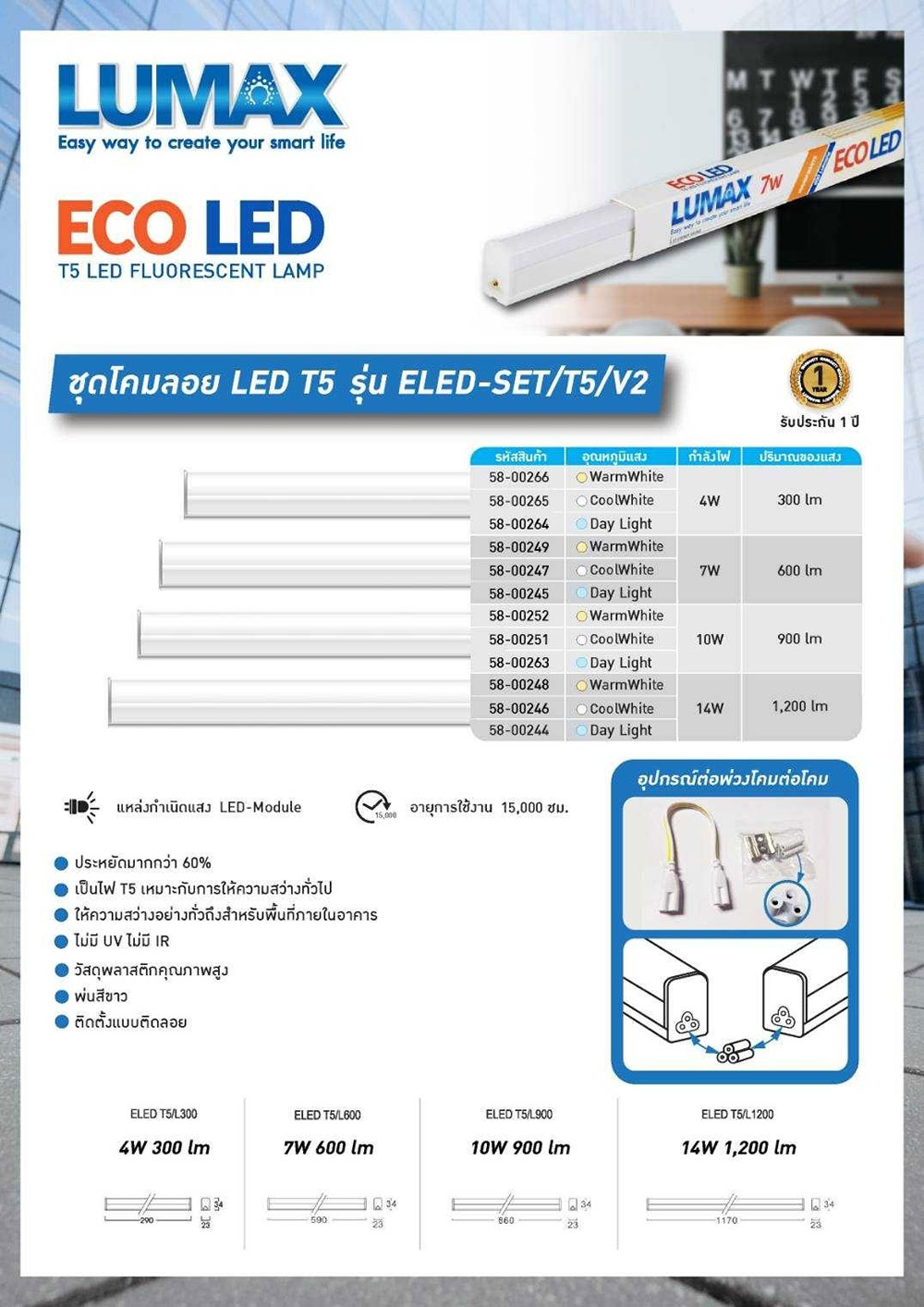 โคมไฟแอลอีดีสำเร็จรูปขนาดเล็ก T5 14 วัตต์ แสงสีขาว