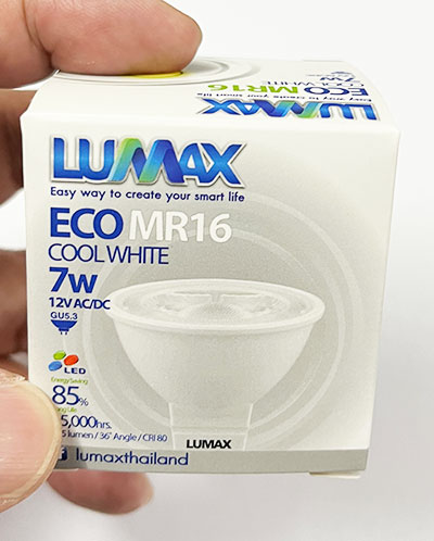หลอดแอลอีดี MR16 ยี่ห้อลูแม๊กซ์ ขนาด 12 โวลท์ 7 วัตต์ 36 องศา แสงสีขาวอมเหลือง ขั้ว GU5.3
