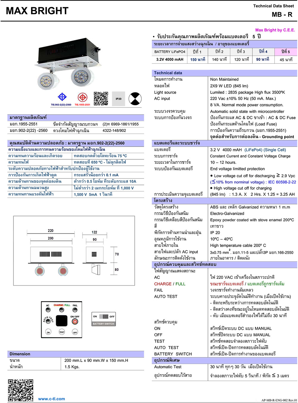 โคมไฟฉุกเฉินยี่ห้อ แม๊กไบรท์ แบบฝังฝ้า แอลอีดี 9W 2 หลอด และ สำรองไฟได้ 2 ชั่วโมง