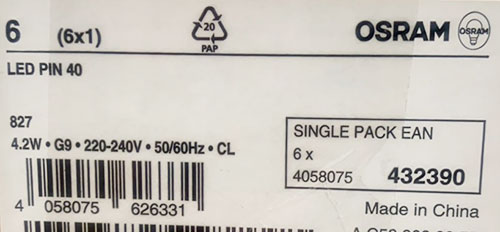 หลอดแอลอีดี ชนิดเสียบ ขั้ว G9 ยี่ห้อออสแรม ขนาด 4.2 วัตต์ แสงสีเหลือง 2700K หรี่แสงไม่ได้