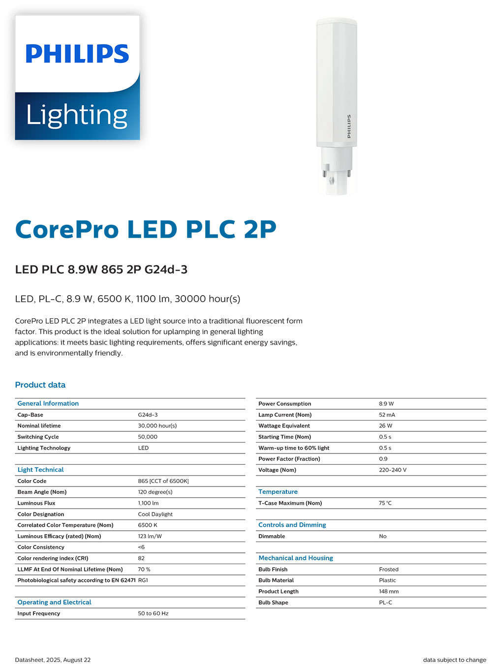 หลอดแอลอีดียี่ห้อฟิลิปส์ ขนาด 8.9 วัตต์ สำหรับขั้ว G24d-3 แสงสีขาว 6500K