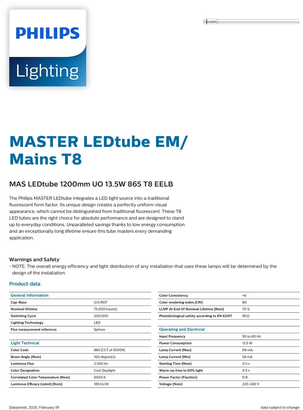 Philips Mas UO T8 LED 13.5W 865 6500K 2500lm (1.2m)