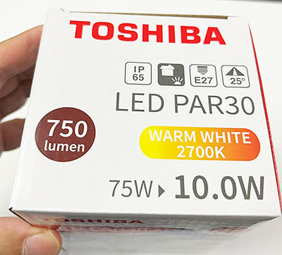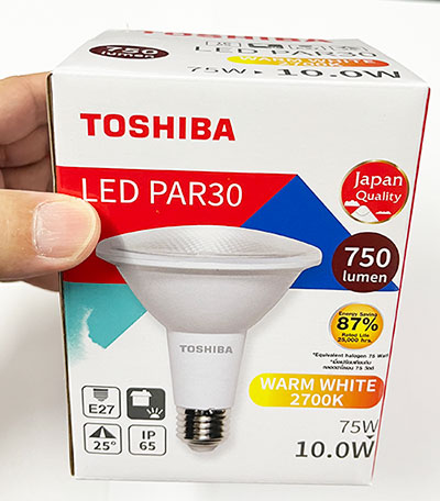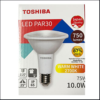 หลอดแอลอีดีพาร์ 30 ยี่ห้อโตชิบา ขั้ว E27 ให้แสงสีเหลือง ขนาด 10 วัตต์ – หรี่แสงไม่ได้